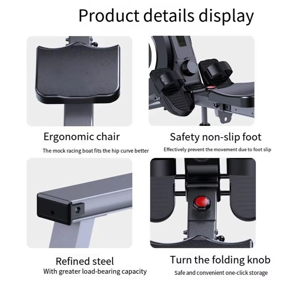 - Features: Magnetic resistance system for smooth, quiet operation, Multi-level resistance control, Real-time LCD display (time, distance, calories, strokes), Foldable space-saving design, Transport wheels for easy movement, Ergonomic rowing motion, Non-slip oversized pedals, Stable structure for intense workouts