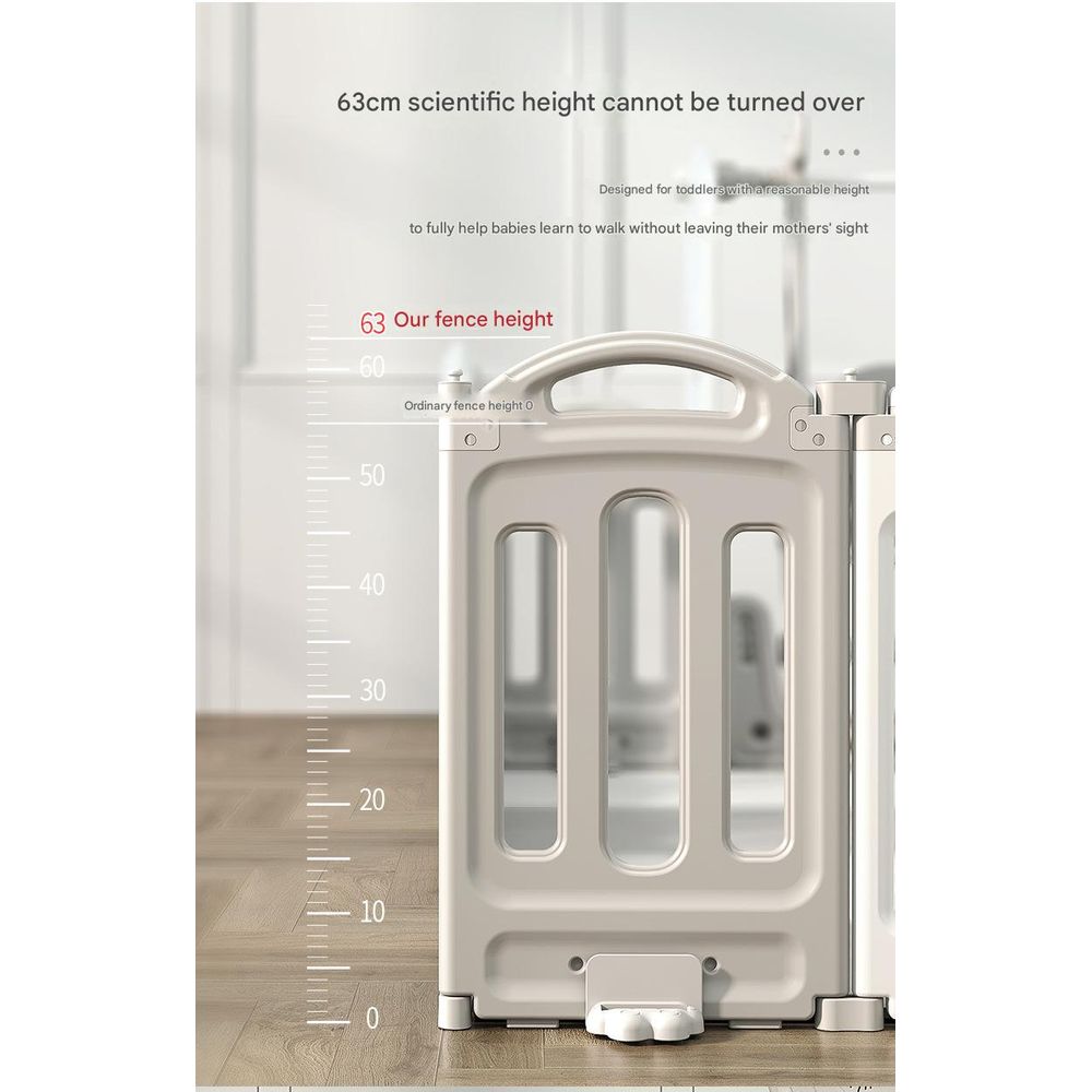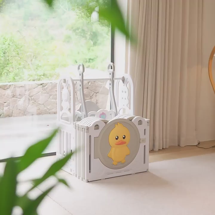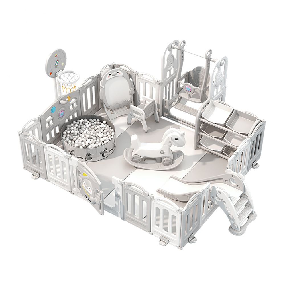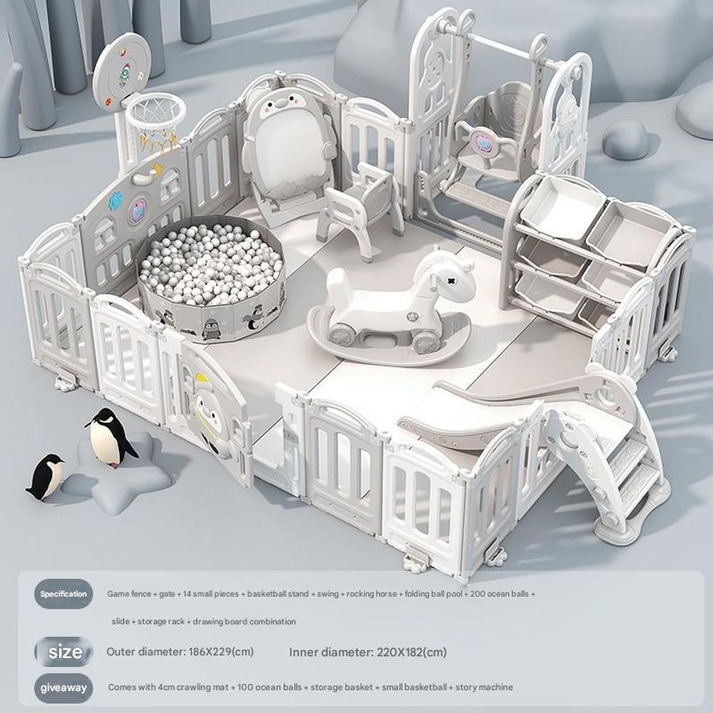 - Package Include: Game fence gate, 14 small pieces basketball stand, swing rocking horse, folding ball pool 200 ocean balls, slide, storage rack, drawing board combination