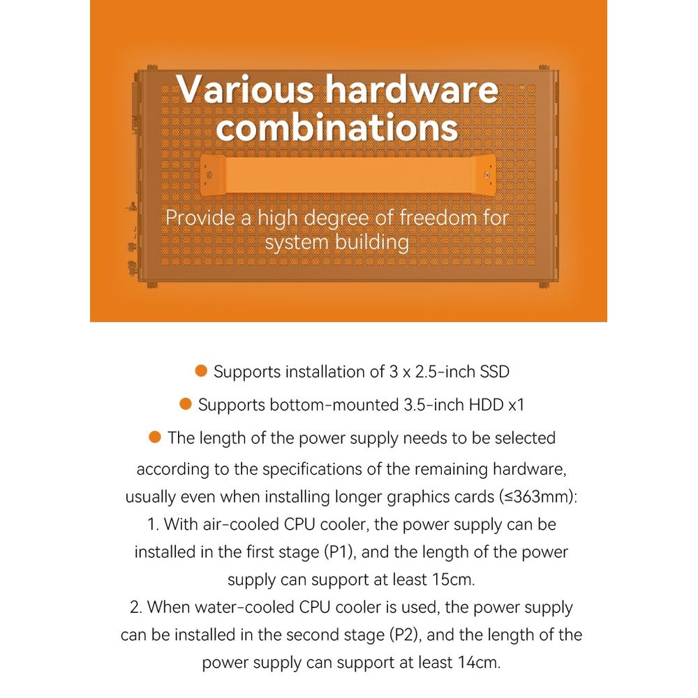 Water cooling support: The air-cooling mode supports at least 15cm long ATX power supply, and the water-cooling mode