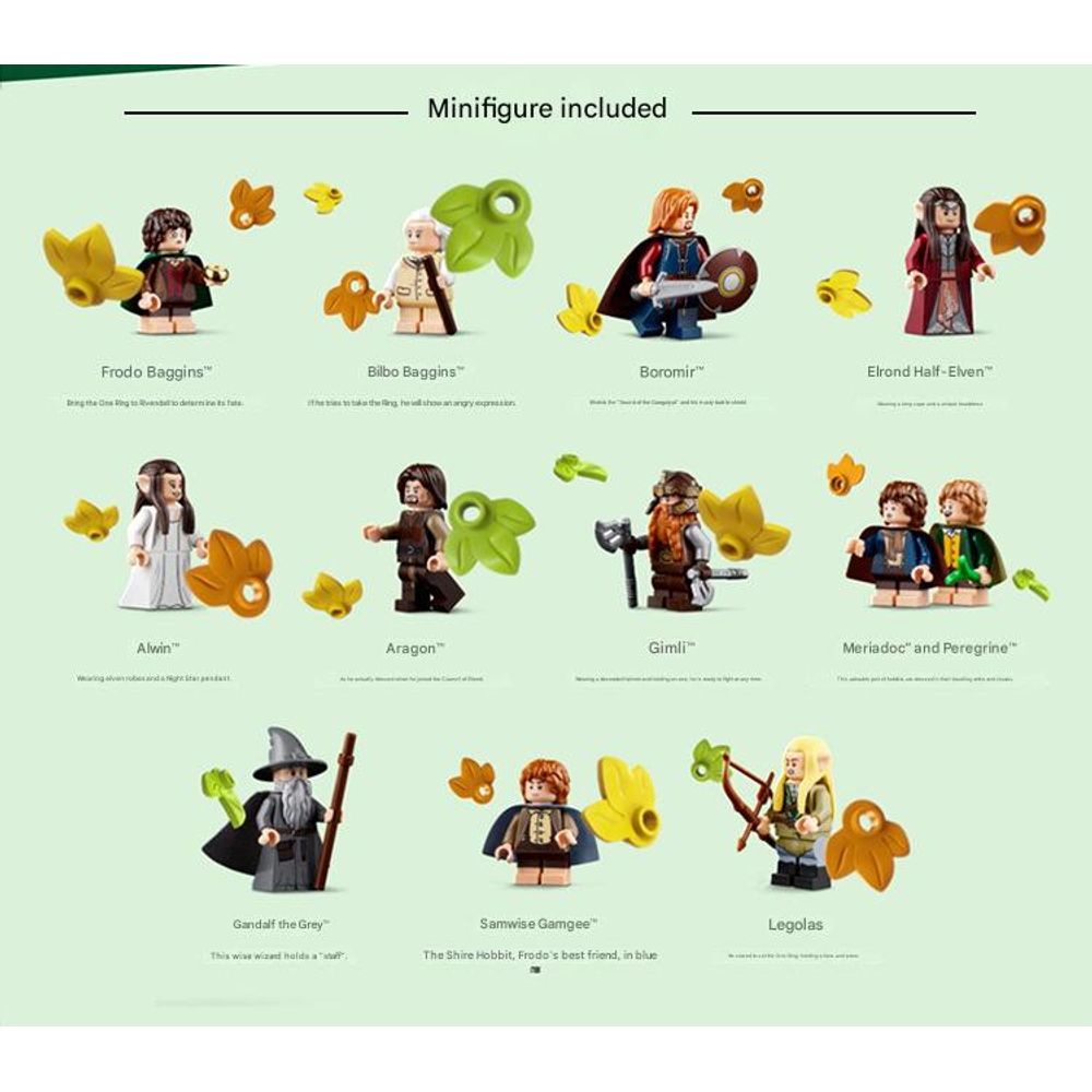 - Includes 15 minifigures of main characters such as Frodo Sam Bilbo Boromir Gimli Aragorn Legolas Gandalf Elrond Arwen and more