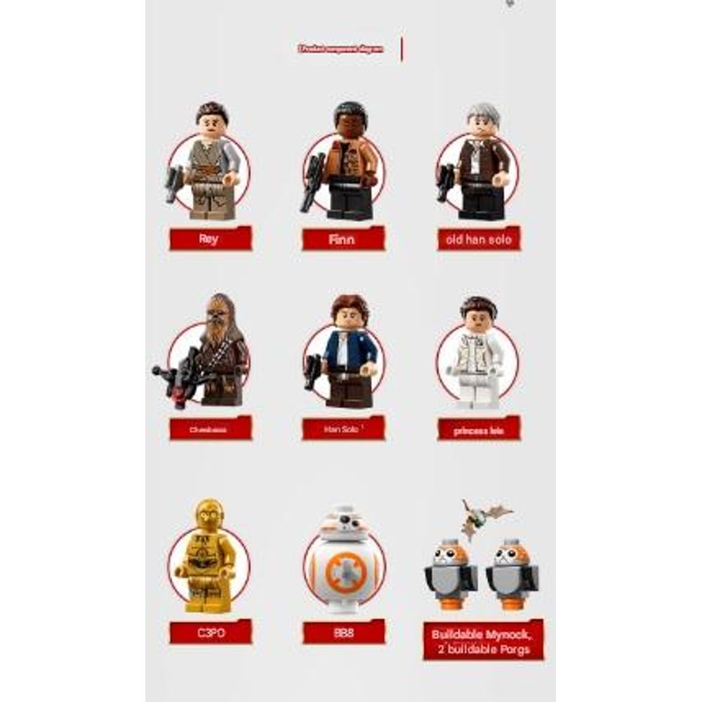 - Includes minifigures of Han Solo, Leia, Chewbacca, C3PO, Rey, Finn, and BB8