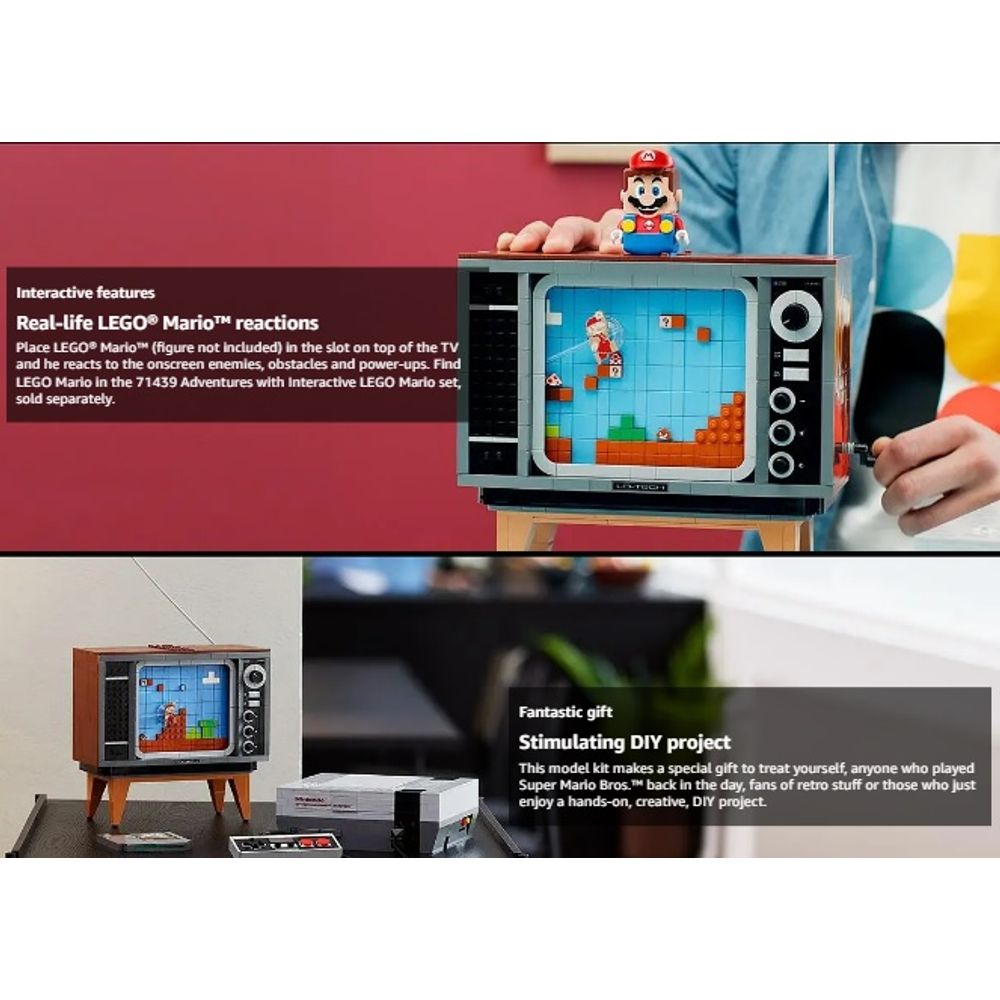 - Comes with a 1980s style television featuring a buildable game scene from Super Mario Bros