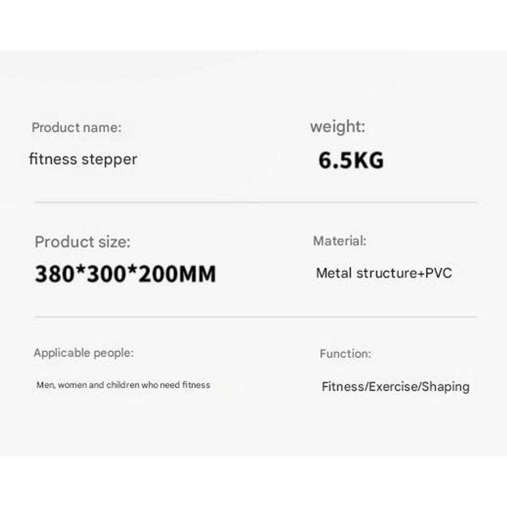 - Design & Structure: Dual-textured anti-slip pedals, Hydraulic resistance cylinders, Adjustable resistance height knob, Stabilizing base frame, Shock-absorbing step motion system, Integrated LCD digital display, Compact and portable structure