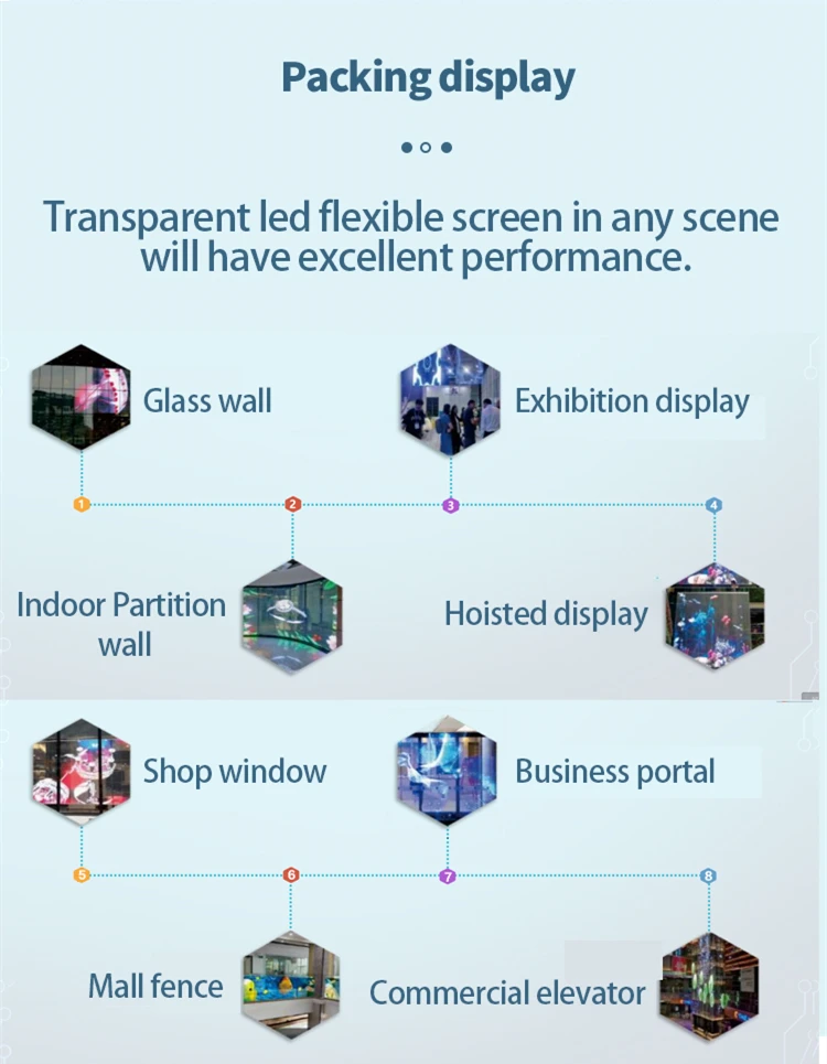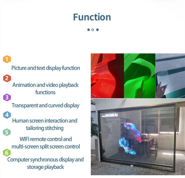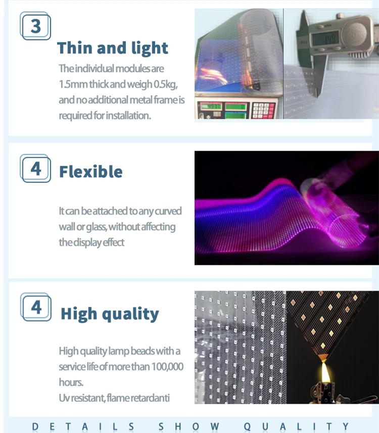 LED transparent film screen has four major characteristics: light, transparent, flexible, thin, and extremely simple installation.No need for steel frame structure, can be attached to the glass surface. Transparent background display, fashionable, beautifulIt is very fashionable, beautiful and modern. With the current VR, AR, artificial intelligence, meta-universe, science fiction,animation, virtual reality, gaming and other technological elements.
