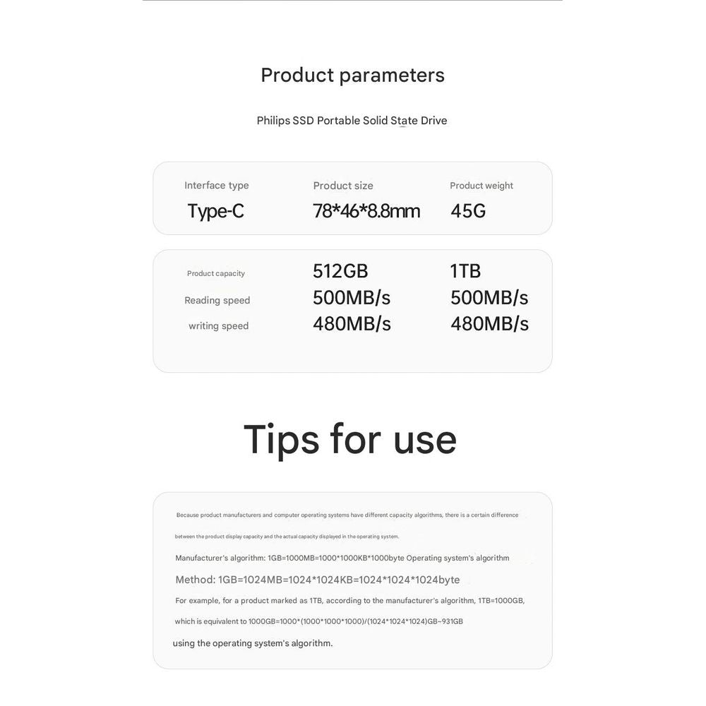 Model: Philips 1TB Type-C 3.0 High-Speed Portable SSD designed for fast data transfer, secure storage, and portable on-the-go use.