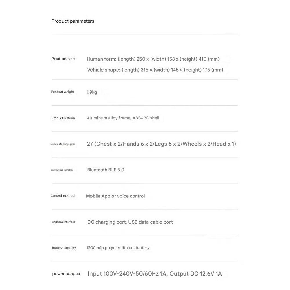 - Battery and Power: Equipped with a 1200mAh polymer lithium battery, the robot provides long-lasting performance for extended interactive sessions. It includes a DC charging port and USB data cable interface, ensuring easy recharging. The power adapter supports 100V–240V input (50/60Hz) with 12.6V DC output, allowing efficient and safe charging.