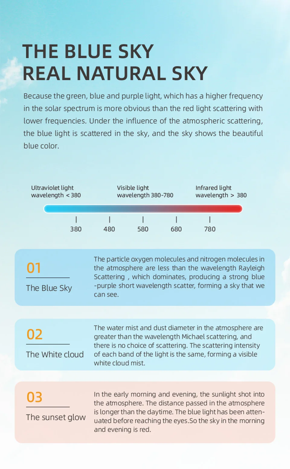 -The White cloud:The water mist and dust diameter in the atmosphere are greater than the wavelength Michael scattering, and there is no choice of scattering. The scattering intensity of each band of the light is the same, forming a visible white cloud mist.