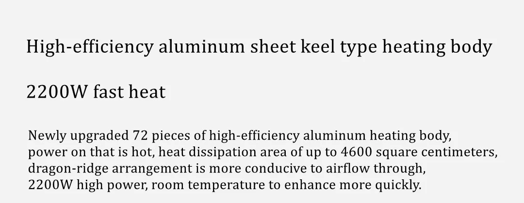 72 pieces of newly upgraded high-efficiency aluminum heating body, power on is hot, heat dissipation area up to 4600 square centimeters, dragon porridge arrangement is more conducive to airflow, 2200W high power, room temperature to improve more quickly.