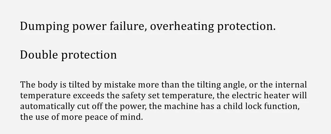 The body is mistakenly tilted more than the tilt angle, or the internal temperature exceeds the safety set temperature, the electric heater will automatically cut off the power, the machine has a child lock function, the use of more peace of mind.