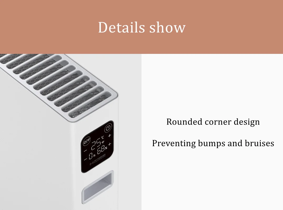 Heat the local air inside the house, causing convection circulation to heat the air inside the house. No fan inside, quiet operation, no obvious perception of air flow, less impact on humidity. Only warmth, no disturbance.