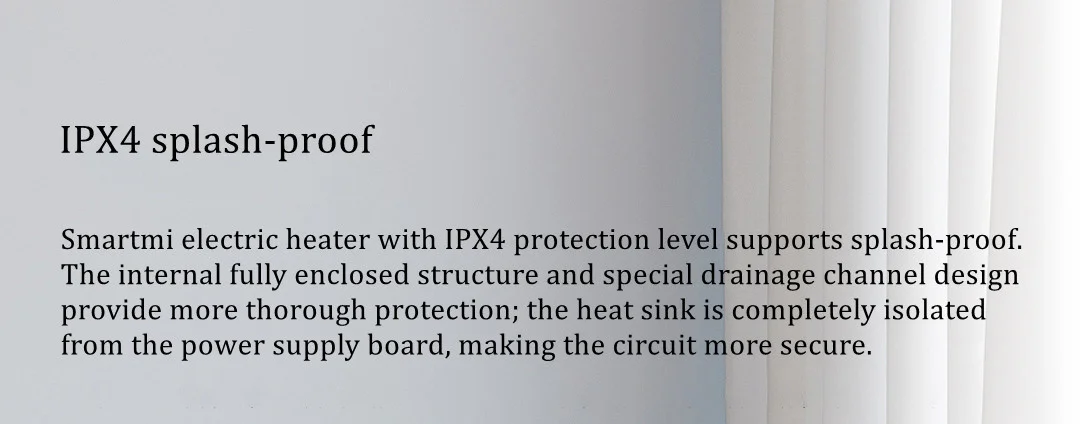 Smartmi electric heater with IPX4 protection level is splash-proof. The fully enclosed internal structure and special drainage channel design provide more comprehensive protection; the heat sink is completely isolated from the power board, making the circuit safer.